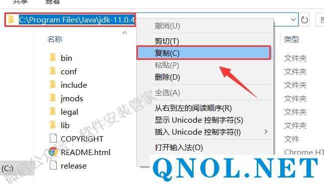 8.打开jdk的安装路径,选中地址栏鼠标右击选择【复制】。