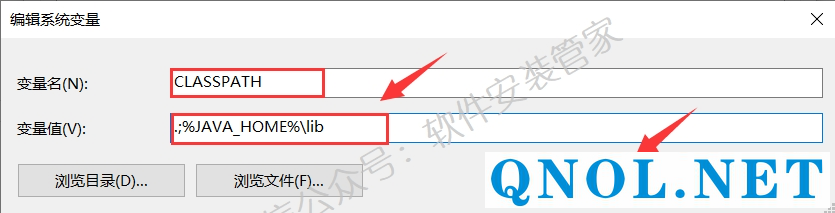 15.变量名中输入【CLASSPATH】,变量值中输入【.;%JAVA_HOME%\lib】(建议直接复制【】里面的内容)然后点击【确定】。