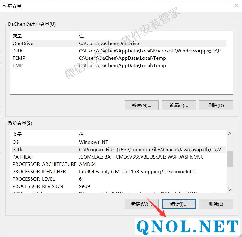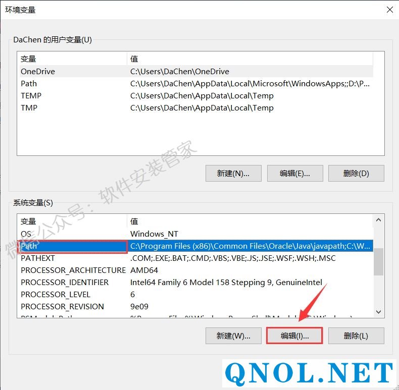 16.找到系统变量中的【Path】变量,然后点击【编辑】。