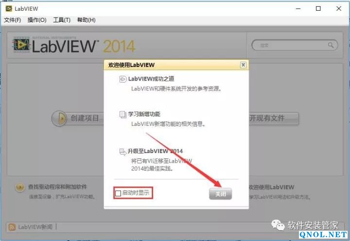27、在开始菜单中找到LABVIEW2014软件打开,取消勾选启动时显示,使其处于未选中状态,点击关闭。