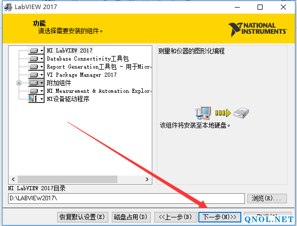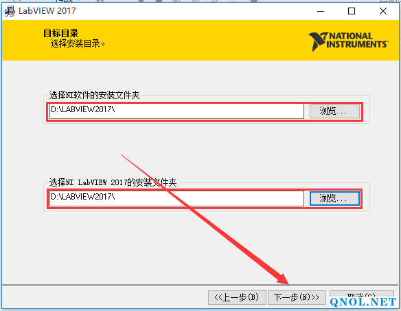9、点击浏览更改安装路径建议安装到除C盘以外的磁盘,可在D盘或者其他盘创建一个LABVIEW2017文件夹。然后点击下一步。