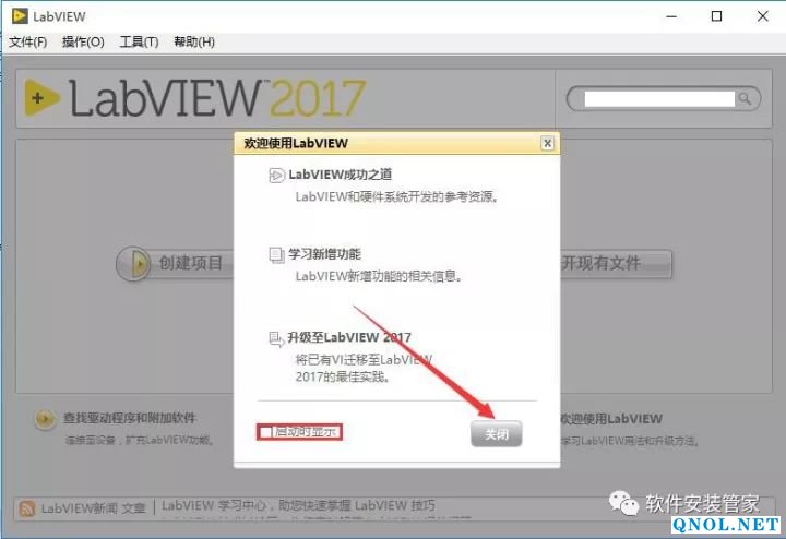 27、在开始菜单栏中找到LabVIEW2017软件打开,取消勾选启动时显示,使其处于未选中状态,点击关闭。