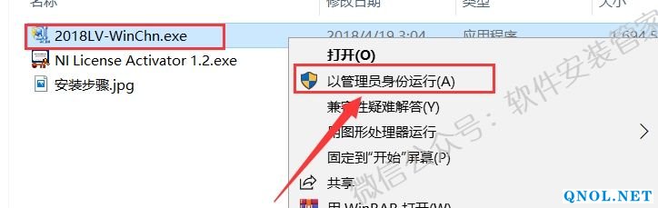 2.选中文件,鼠标右击选择以管理员身份打开2018LV-WinChn.exe文件。