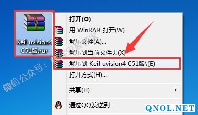 1.选中【Keil uvision4 C51版】压缩包,鼠标右击选择【解压到Keil uvision 4 C51版】。