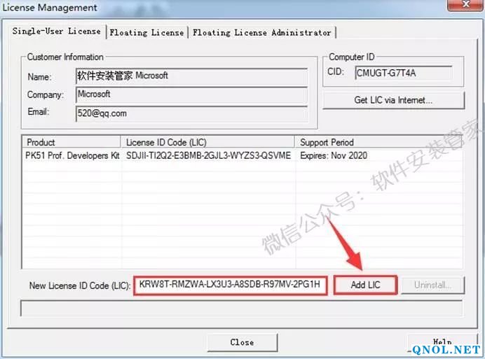 16.在【NewLicense ID Code】框里面使用快捷键Ctrl+V粘贴注册码,然后点击【添加LIC】。