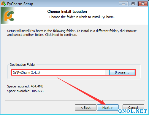 5、点击Browse更改安装路径,建议安装到除C盘以外的磁盘,可在D盘或者其它盘创建一个PyCharm 3.4.1。然后点击Next。