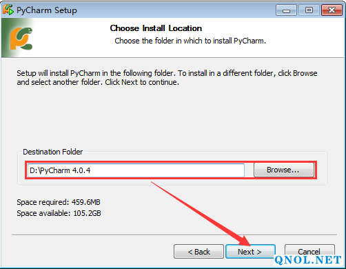 5、点击Browse更改安装路径,建议安装到除C盘以外的磁盘,可在D盘或者其它盘创建一个PyCharm 4.04文件夹。然后点击Next。