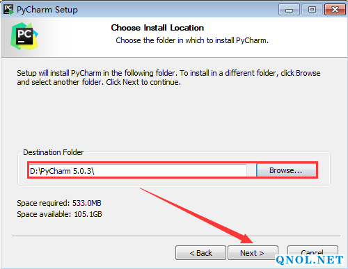4、点击Browse更改安装路径,建议安装到除C盘以外的磁盘,可在D盘或者其它盘创建一个PyCharm 5.0.3文件夹,然后点击Next。