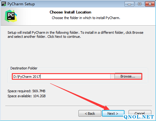 4、点击Browse更改安装路径,建议安装到除C盘以外的磁盘,可在D盘或者其它盘创建一个PyCharm 2017文件夹,然后点击Next。