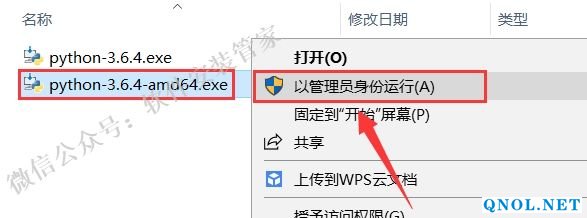 3.在桌面鼠标右击我的电脑选择属性查看自己的电脑位数,64位系统选中【python-3.6.4.amd64】(32位系统就选中上面的)鼠标右击选择【以管理员身份运行】。