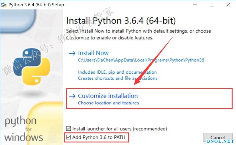 4.勾选【Add Python 3.6 to PATH】,然后点击【Customize installation】。