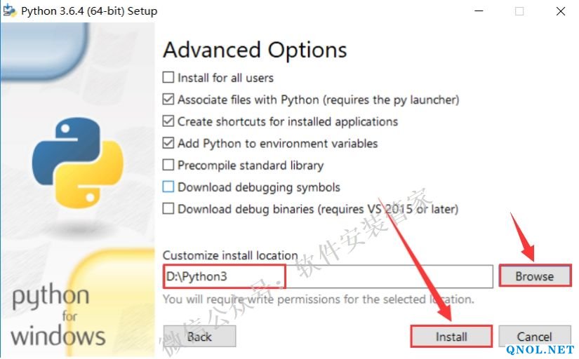 6.点击【Browse】更改软件的安装目录,建议在D盘或其他磁盘新建一个【Python3】文件夹,点击【Install】。