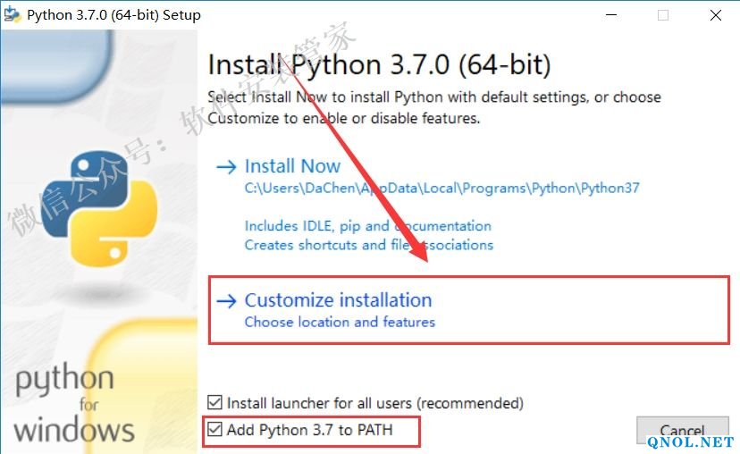 4.勾选【Add Python 3.7 to PATH】,然后点击【Customize installation】。