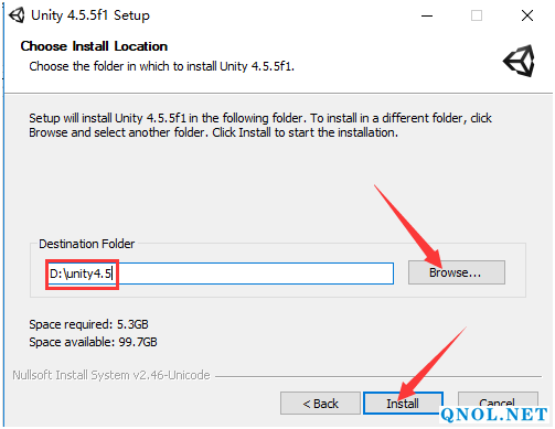 6、点击Browse更改安装路径,建议安装在除C盘以外的其它磁盘,可以在D盘或者其它磁盘创建一个unity4.5文件夹,然后点击Install。