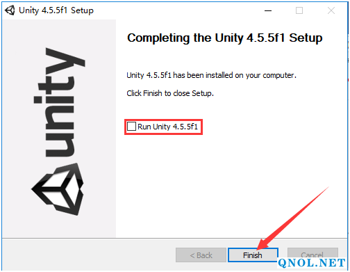 8、把Run Unity4.5.5f1前面的勾去掉,然后点击Finish。