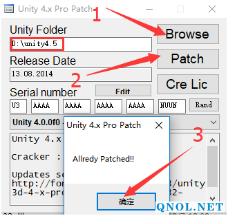 13、点击Browse选择D盘中unity4.5,然后点击Patch,点击确定。
