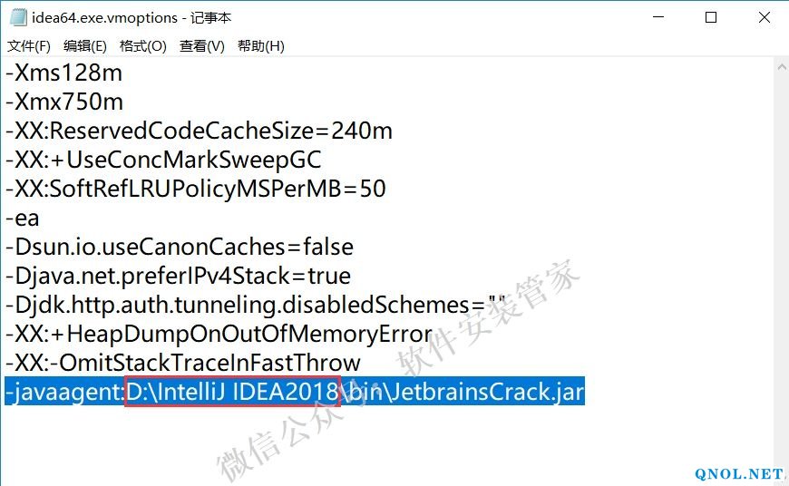 15.在文档的最后面加上【-javaagent:D:\IntelliJ IDEA2017\bin\JetbrainsCrack.jar】其中【D:\IntelliJ IDEA2017】是软件的安装目录,然后按下快捷键Ctrl+S保存该文档。