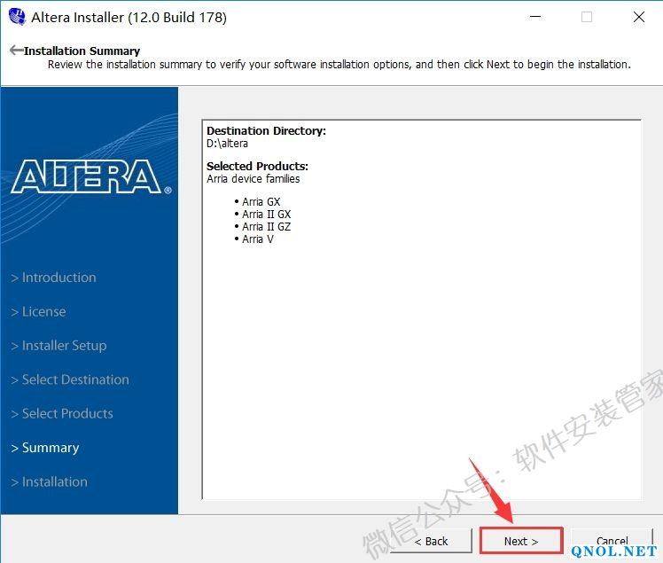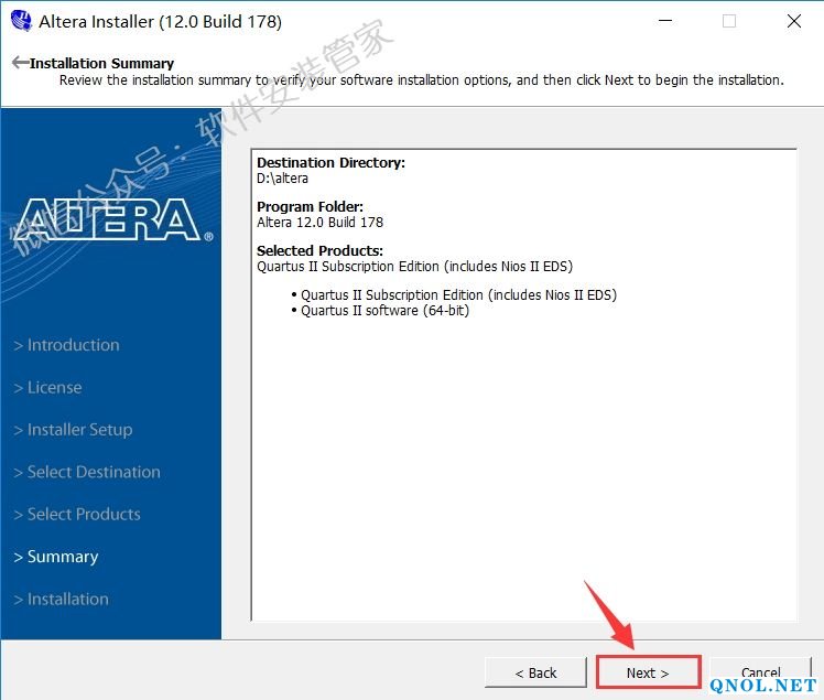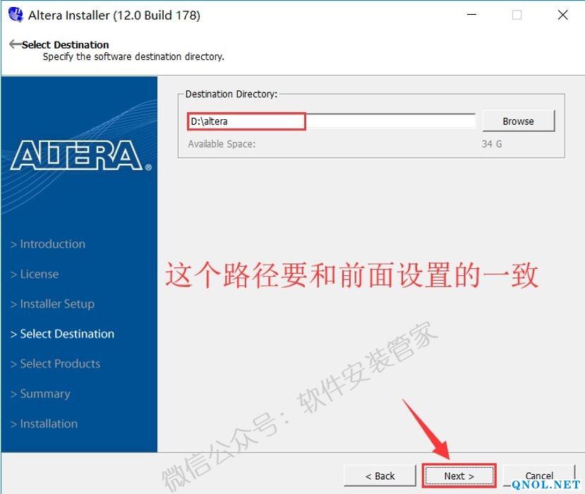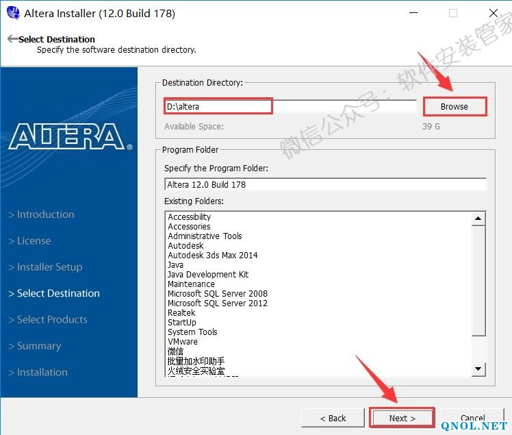 9.点击【Browse】更改软件的安装路径,建议安装在除C盘之外的其它磁盘,可以在D盘或其它磁盘新建一个【altera】文件夹,然后点击【Next>】。