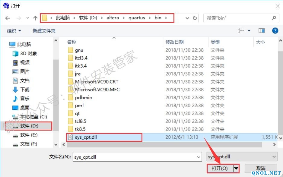 32.打开软件安装路径下的【bin】文件夹(我这里的路径为D:\altera\quartus\bin)再选中里面【sys_cpt.dll】文件,然后点击【打开】。