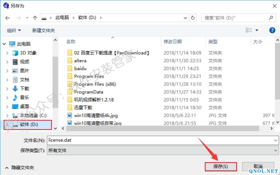 33.选择D盘根目录保存激活文件,点击【保存】。