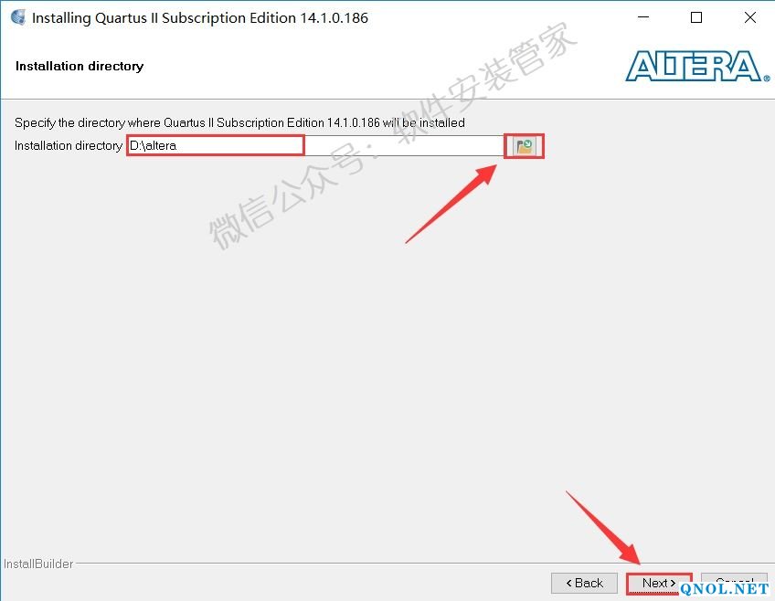 7.点击文件夹小图标更改软件的安装路径,建议安装在除C盘之外的其它磁盘,可以在D盘或其它磁盘新建一个【altera】文件夹,然后点击【Next>】。