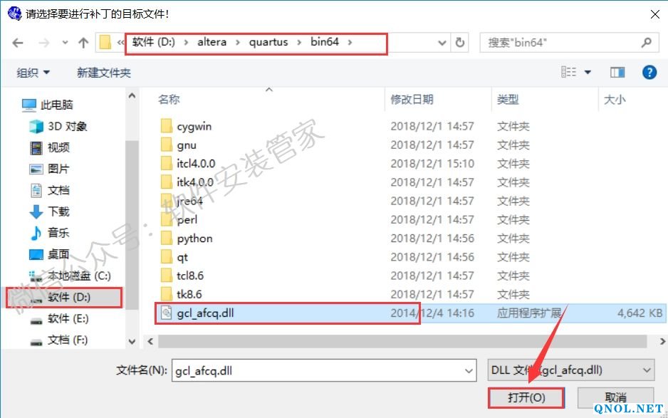 27.打开软件安装路径下的【bin64】文件夹(我这里的路径为D:\altera\quartus\bin64)再选中里面【gcl_afcq.dll】文件,然后点击【打开】。