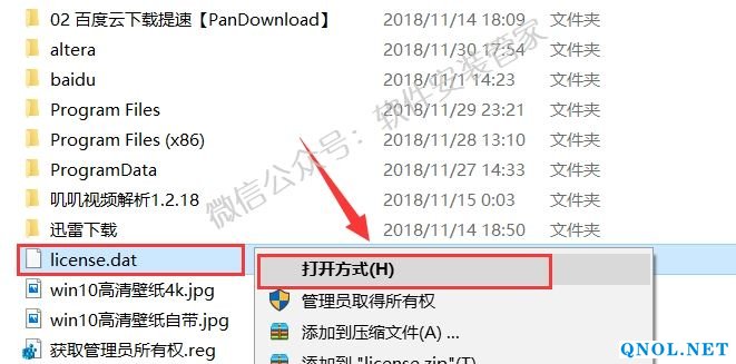 38.在D盘的根目录下选中【license.dat】文件,鼠标右击选择【打开方式】。