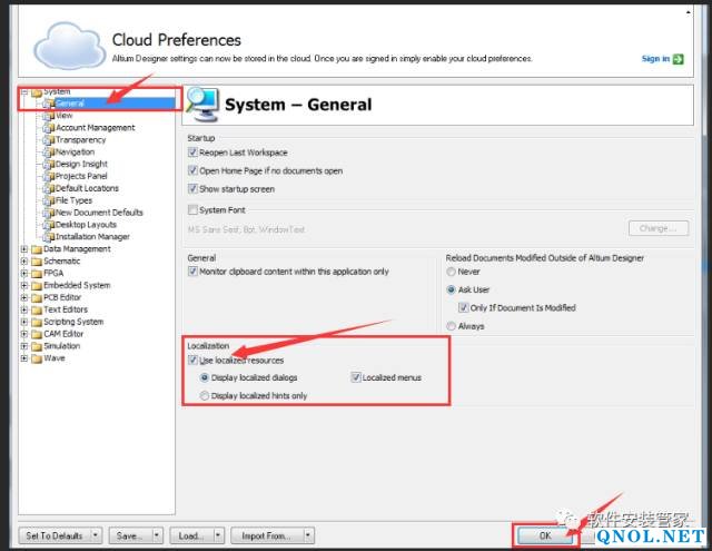 7.选择“General”,再选择“Use localized resources”,点击“OK”,关闭软件,重新打开软件。