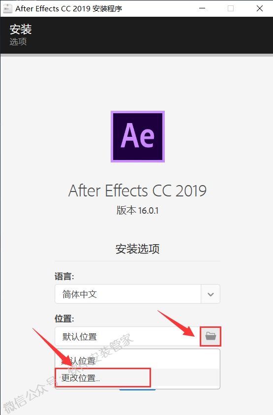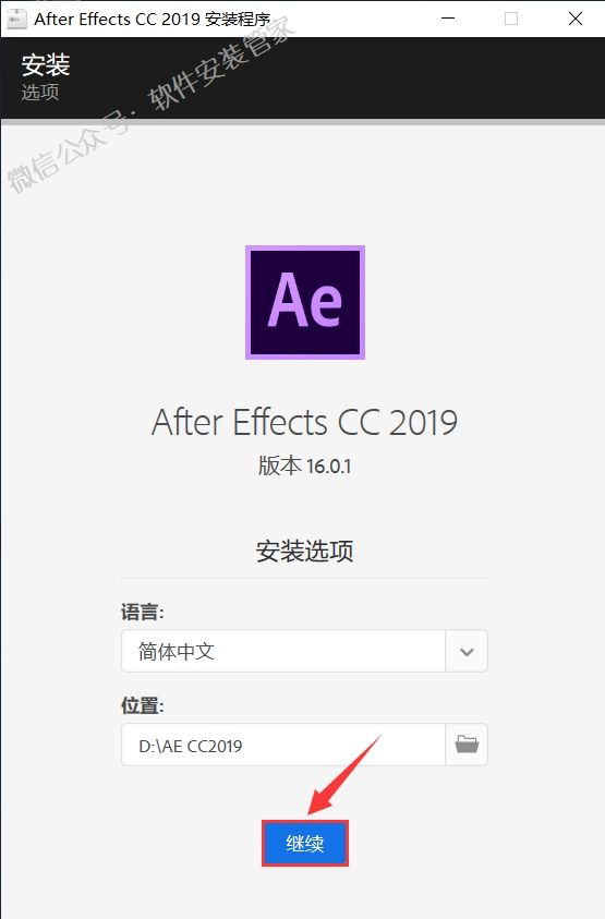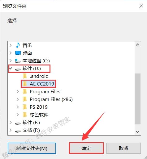 5.建议安装到除C盘以外的磁盘,可以在D盘或其他盘新建一个【AE CC2019】文件夹,然后点击【确定】。