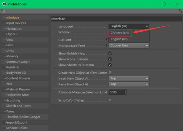 21.中英文切换。软件默认语言为英文,打开C4D软件后,按快捷键:CTRL+E,弹出设置界面,在Language中选择Chinese,最后重启软件即可。