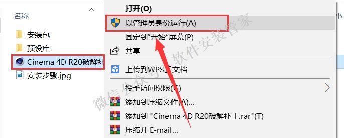 14.打开之前解压好的【Cinema 4D R20】文件夹,选中【Cinema 4D R20破解补丁】鼠标右击选择【以管理员身份运行】。