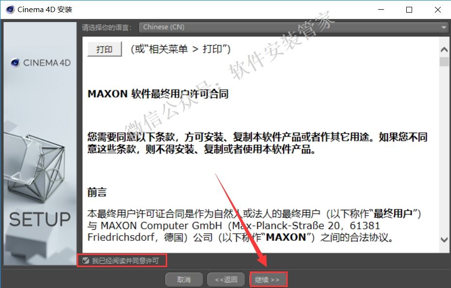 10.勾选【我已阅读并同意许可】,点击【继续】。