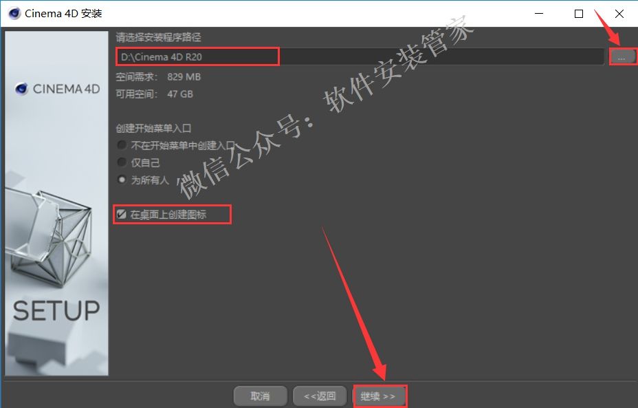 11.点击按钮更改软件的安装目录,建议安装在除C盘之外的磁盘,可在D盘或其他盘新建一个【Cinema 4D R20】文件夹,勾选【在桌面创建图标】,然后点击【继续】。