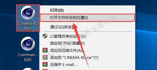 22.在桌面找到并选中【Cinema 4D R20】图标,鼠标右击选择【打开文件所在的位置】。