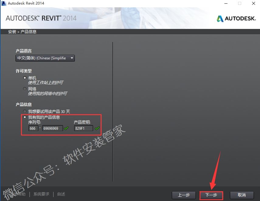 7.输入序列号:666-69696969 产品密钥:829F1 然后点击【下一步】。