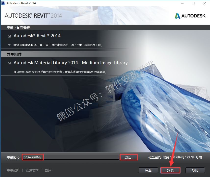 8.点击【浏览】更改软件安装路径:建议安装到除C盘以外的磁盘,可在D盘或其它盘里面新建一个文件夹【Revit2014】然后点击【安装】。