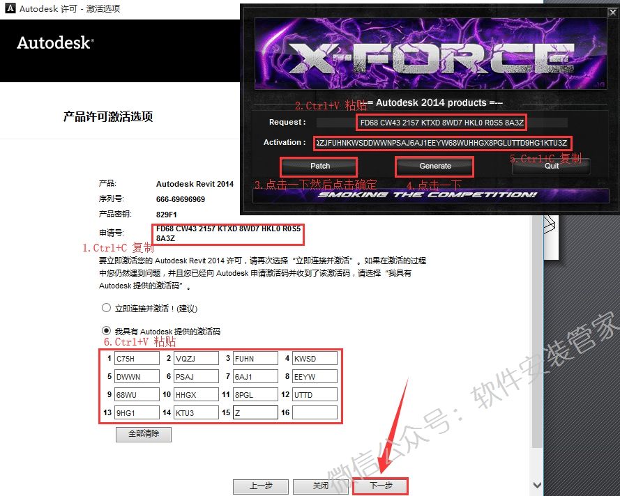 18.把申请号复制到注册机里面的Request中(记得删除原Request中的内容),先点击Patch然后点击确定,再点击Generate后复制Activation中生成的激活码,然后粘贴激活码至我具有Autodesk提供的激活码方框中,最后点击下一步即可。