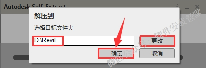 4.点击【更改】选择解压目标文件夹,可在D盘或其它盘里面新建一个【Revit】文件夹(等软件安装完成后再删除此文件夹),然后点击【确定】。