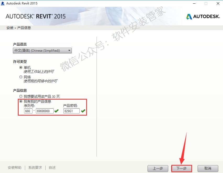 8.输入序列号:666-69696969 产品密钥:829G1 然后点击【下一步】。