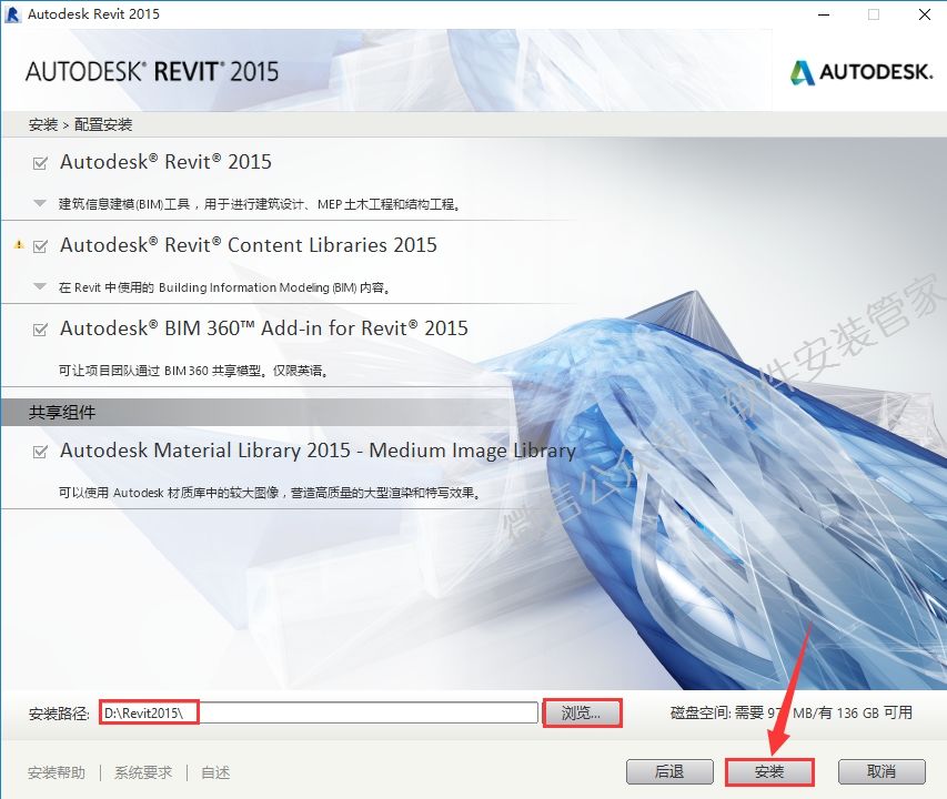 9.点击【浏览】更改软件安装路径:建议安装到除C盘以外的磁盘,可在D盘或其它盘里面新建一个文件夹【Revit2015】然后点击【安装】。