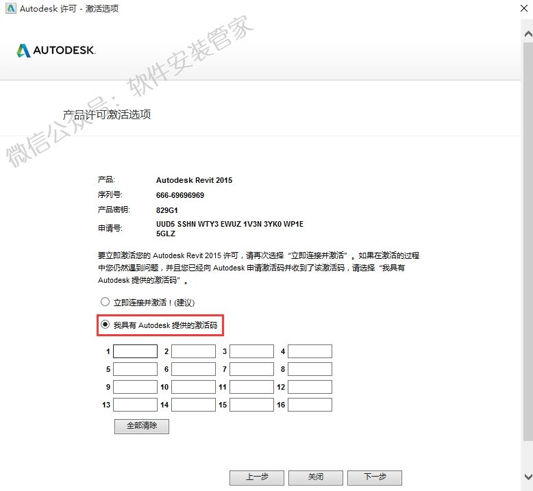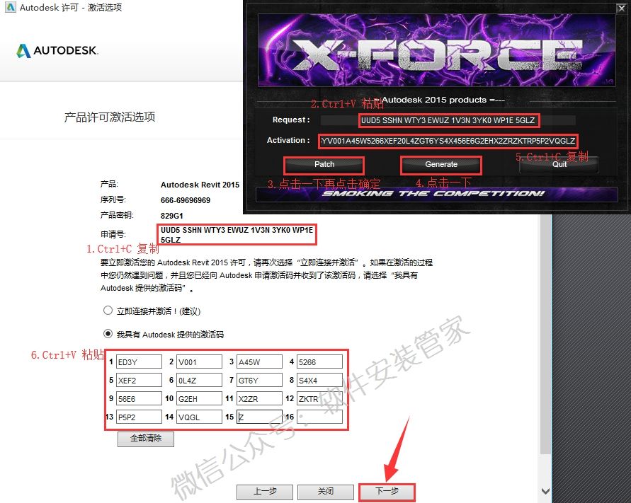 19.把申请号复制到注册机里面的Request中(记得删除原Request中的内容),先点击Patch然后点击确定,再点击Generate后复制Activation中生成的激活码,然后粘贴激活码至我具有Autodesk提供的激活码方框中,最后点击下一步即可。