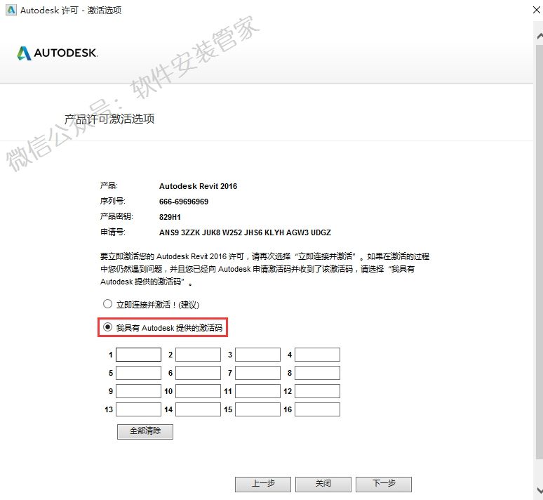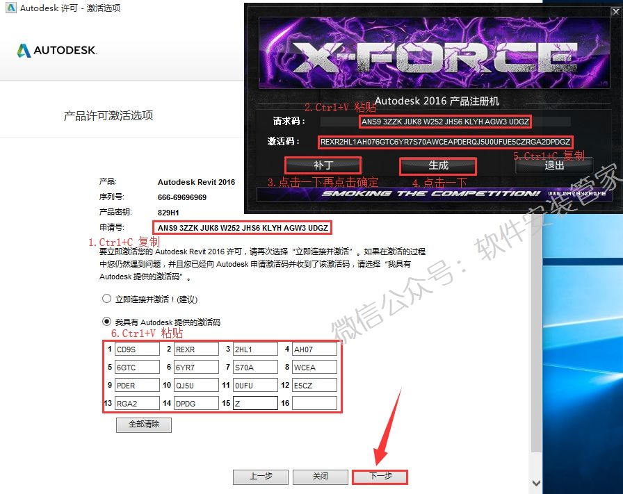 18.把申请号复制到注册机里面的【请求码】中(记得删除原请求码中的内容),先点击【补丁】然后点击确定,再点击【生成】后复制【激活码】中生成的激活码,然后粘贴激活码至我具有Autodesk提供的激活码方框中,最后点击下一步即可。