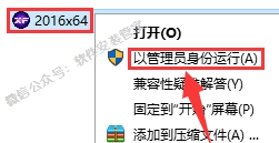 17.选中【2016x64】后,鼠标右击选择【以管理员身份运行】。温馨提示:若打开注册机文件夹后里面没有注册机程序,则需要关闭你电脑杀毒软件和防火墙后再重新解压安装包后打开。