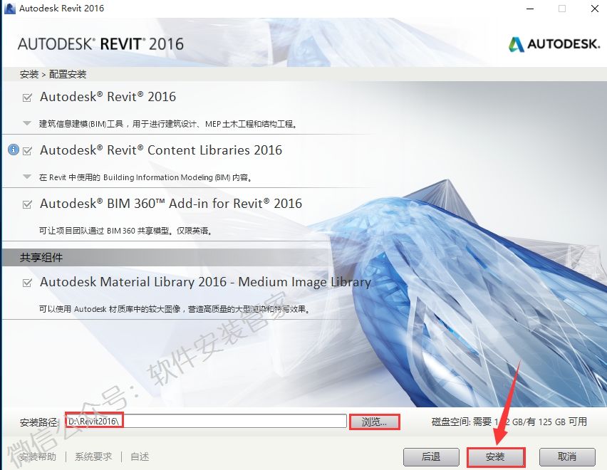 8.点击【浏览】更改软件安装路径:建议安装到除C盘以外的磁盘,可在D盘或其它盘里面新建一个文件夹【Revit2016】然后点击【安装】。
