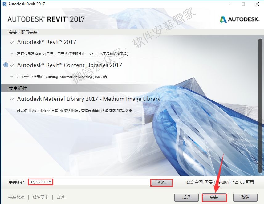 9.点击【浏览】更改软件安装路径:建议安装到除C盘以外的磁盘,可在D盘或其它盘里面新建一个文件夹【Revit2017】然后点击【安装】。