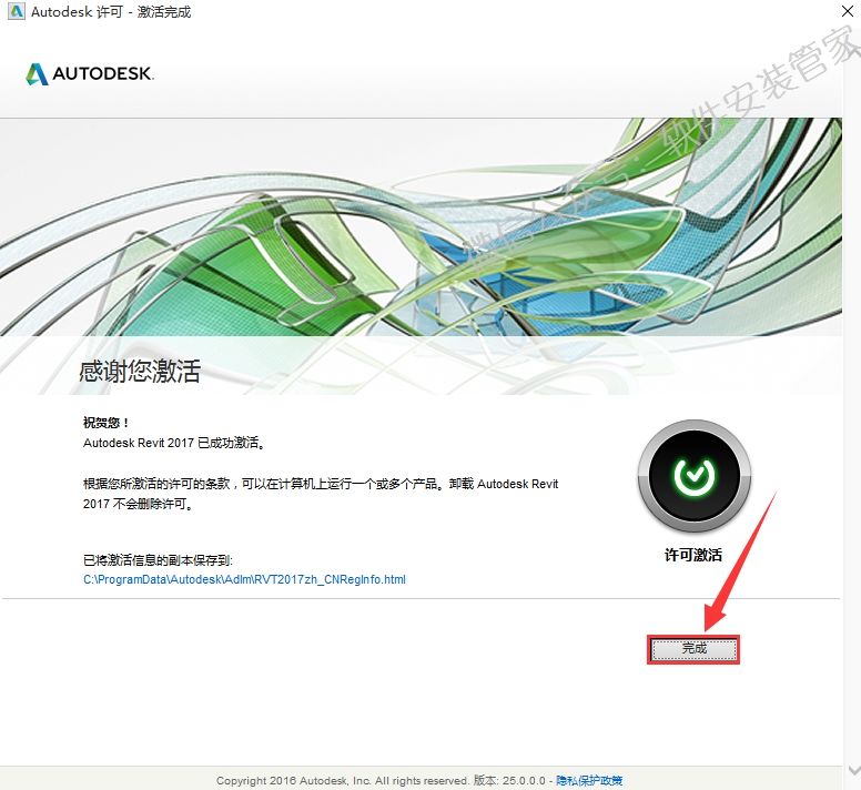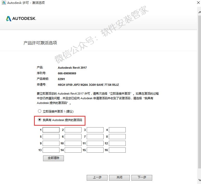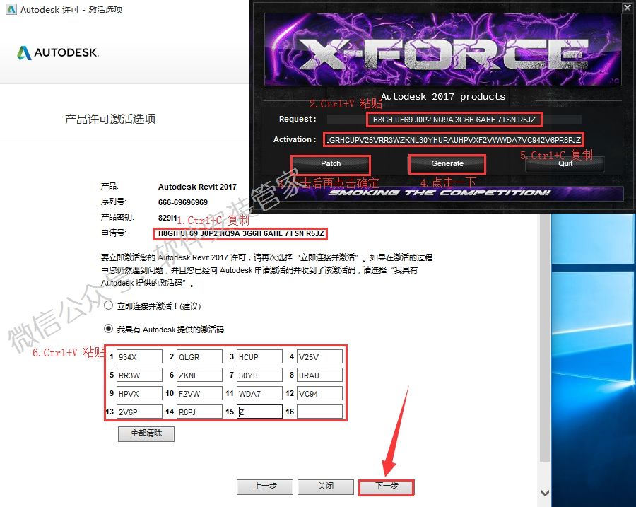 20.把申请号复制到注册机里面的Request中(记得删除原Request中的内容),先点击Patch然后点击确定,再点击Generate后复制Activation中生成的激活码,然后粘贴激活码至我具有Autodesk提供的激活码方框中,最后点击下一步即可。