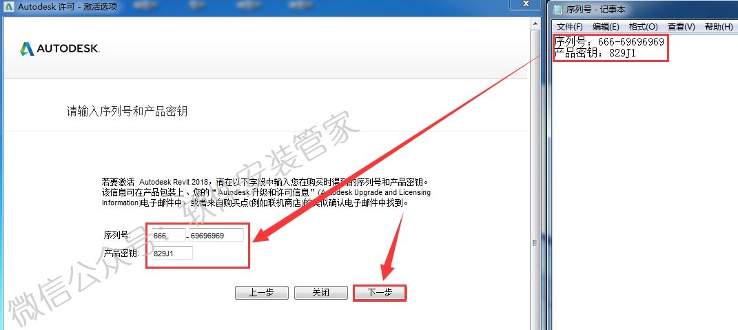 16.将记事本中的序列号和产品密钥分别“Ctrl+C复制”,“Ctrl+V粘贴”至左图中箭头所指处,然后点击“下一步”。