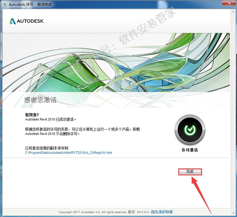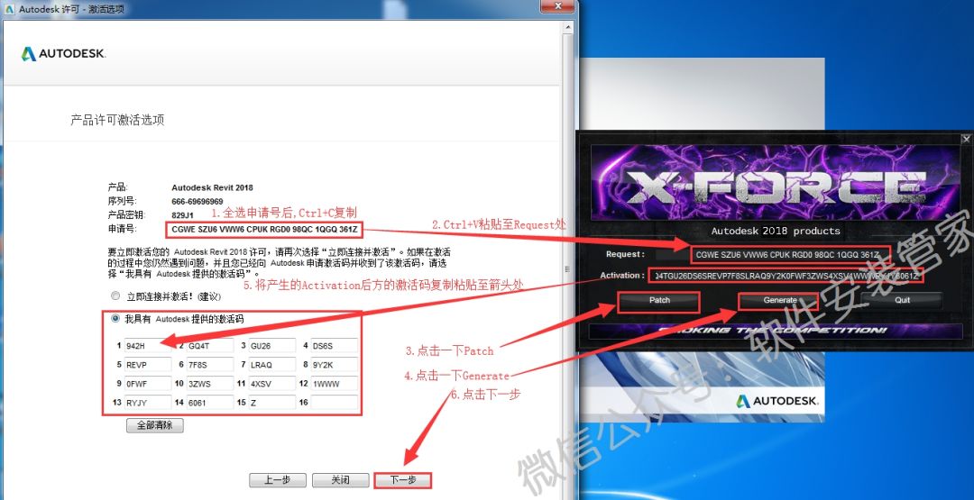 19.把申请号复制到注册机里面的Request中(记得删除原Request中的内容),先点击Patch然后点击确定,再点击Generate后复制Activation中生成的激活码,然后粘贴激活码至我具有Autodesk提供的激活码方框中,最后点击下一步即可。