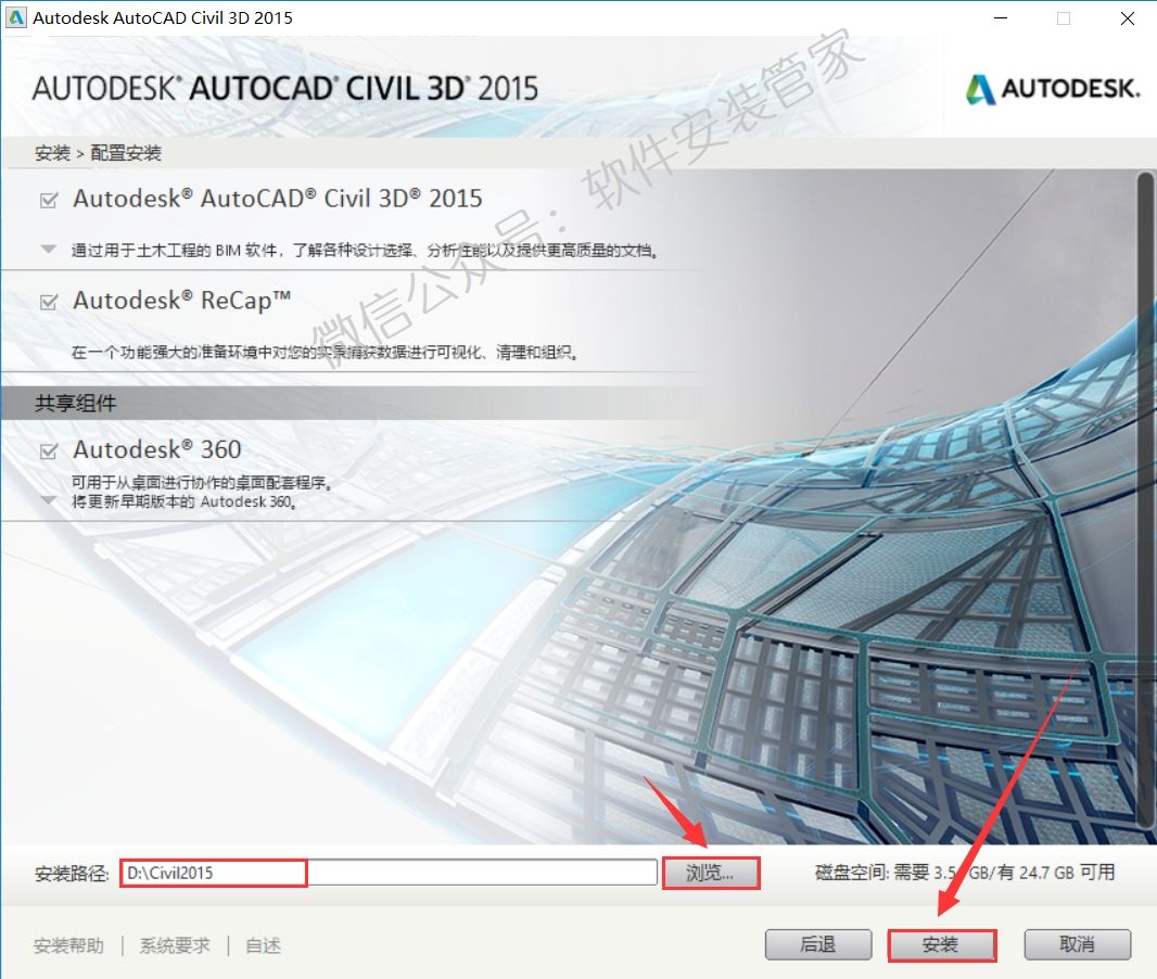 8.点击【浏览】更改软件的安装目录,建议安装在除C盘之外的盘符,可以在D盘或其它盘里面新建一个【Civil2015】的文件夹,然后点击【安装】。