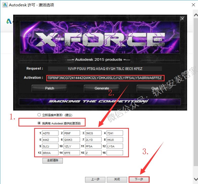 21.点击【我具有Autodesk提供的激活码】,Ctrl+C复制【Activation】中的激活码,Ctrl+V粘贴到【我具有Autodesk提供的激活码】的下面的方格中,然后点击【下一步】。